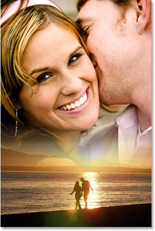 A imagem da praia parece boa, mas a imagem do casal atrás dela precisa ser aumentada. Novamente, há um pequeno problema. A imagem está na camada Plano de fundo: