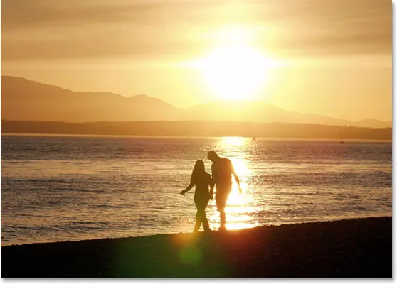 Assim, a camada não é mais uma camada especial de plano de fundo, e agora estamos livres para mover a imagem na camada. Com minha ferramenta Mover ainda selecionada, clicarei dentro do documento e arrasto a foto do casal para cima. Como quero ter certeza de que estou arrastando para cima e não acidentalmente arrastando a imagem um pouco para os lados, vou segurar novamente minha tecla Shift enquanto estou arrastando:
